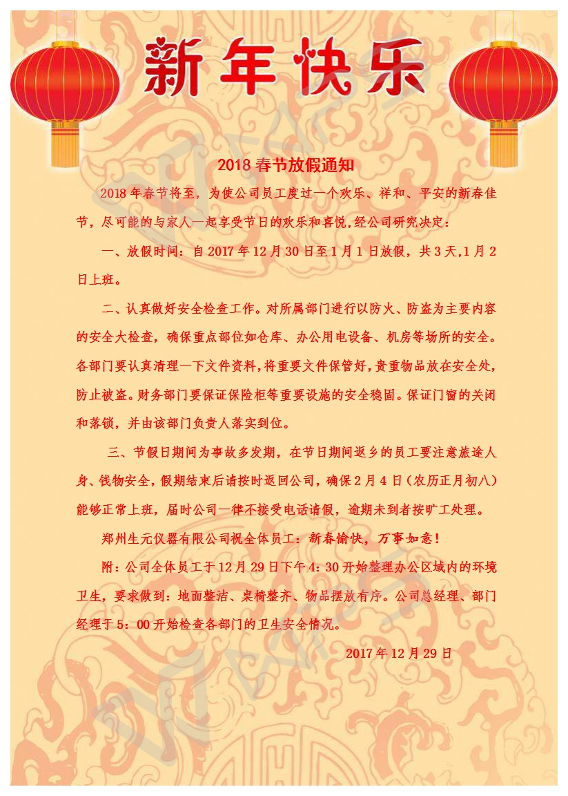 鄭州生元儀器有限公司2018春節放假通知
